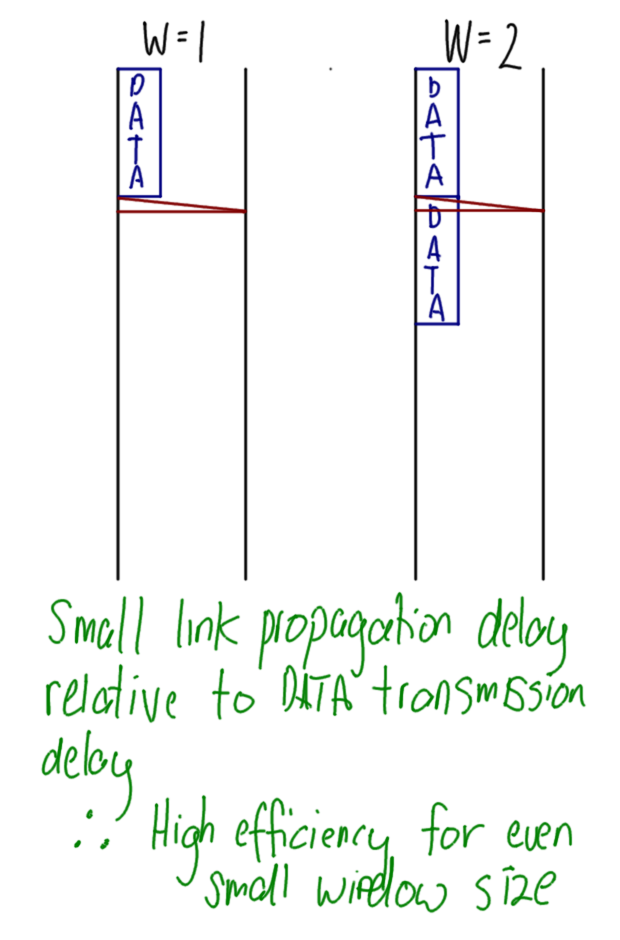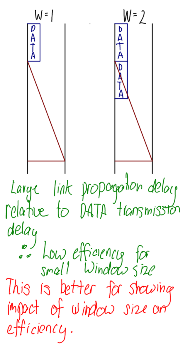 The efficiency of sliding window mainly depends on: DATA transmission time, propagation time (to B and back) and window size. If you choose "appropriate" values of DATA transmission time (depends on data size and data rate) and propagation time (the delay from A to B, since in the experiments you set the delay from B to A to 0), then you should see changes of efficiency as the window size changes (at least for several values of window size). What are "appropriate" values of transmission and propagation time? Consider the following example where the transmission time is much larger than the propagation time. Here is the timing diagram for window of 1 and 2 (note in your experiments you should NOT use a window of 2; it should be 1, 3, 7, 15, ...).